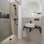 1-slaapkamer Zentrales Studio Apartment 'The Garage' Hbf-Messe-Ovb Arena-City is ingericht met een bureau en biedt moderne faciliteiten zoals een flatscreen TV met satellietzenders. Tot de veiligheidsvoorzieningen op de kamer behoren rookmelders. Het appartement heeft 1 slaapkamer. 1 badkamer heeft een inloopdouche en een apart toilet, plus een haardroger en handdoeken.